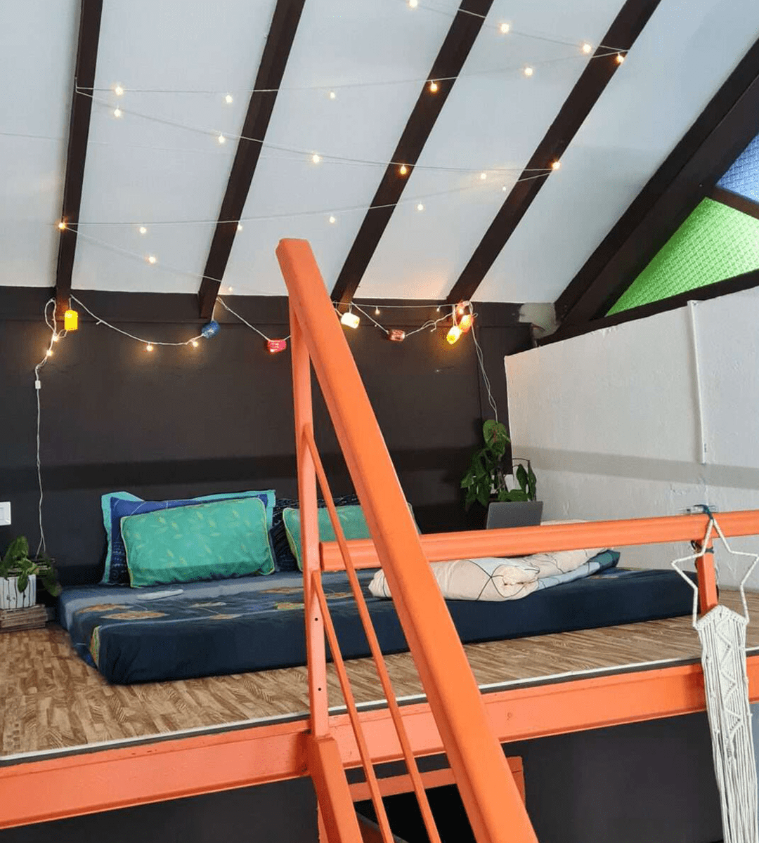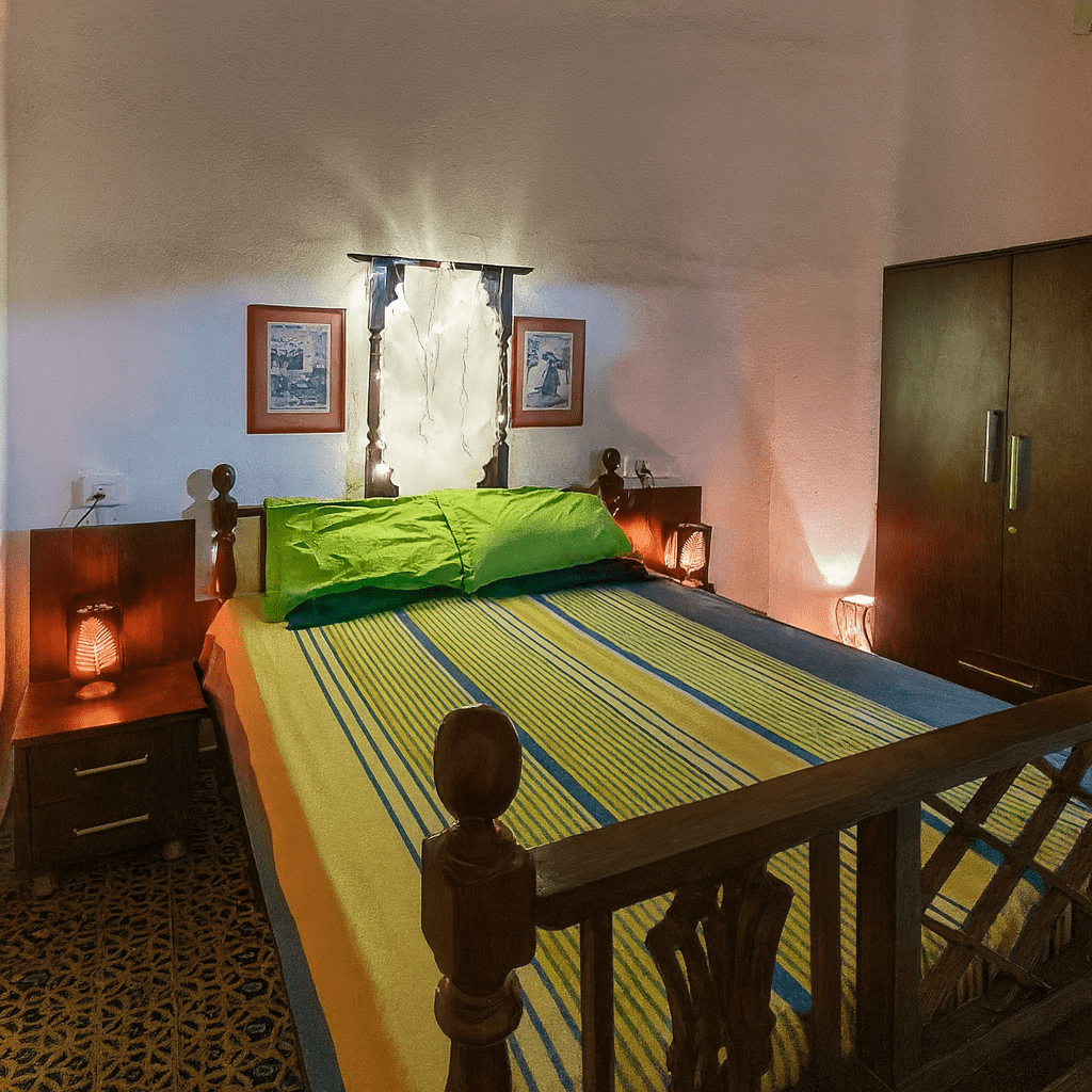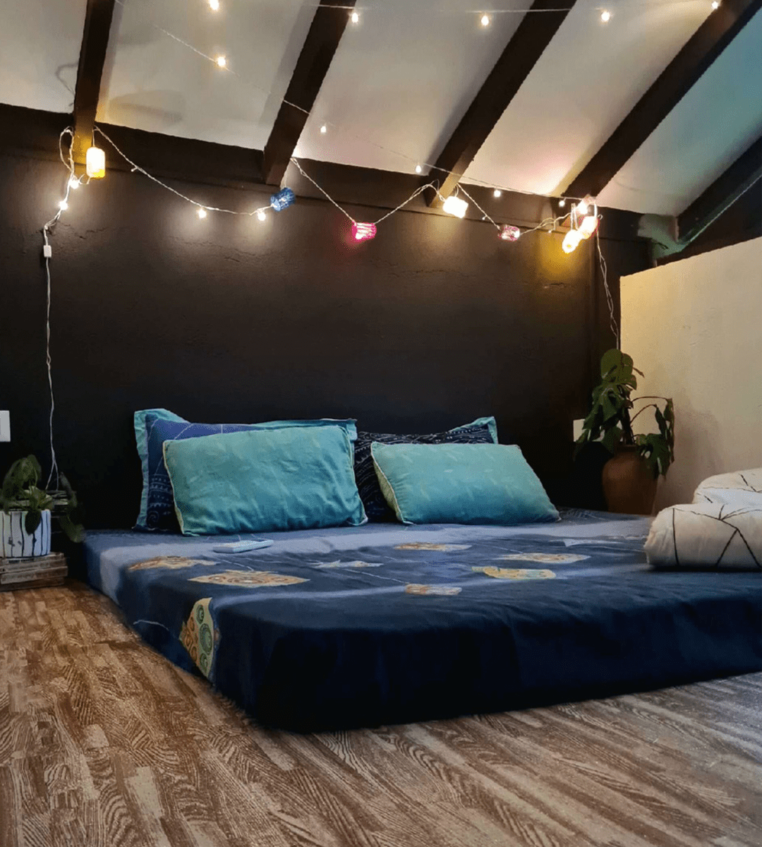 Cozy loft bed in the Loft Room at Valentine Villa Goa, featuring a comfortable mattress, soft linens, and a unique elevated view of the room's creative space under rustic wooden beams.
