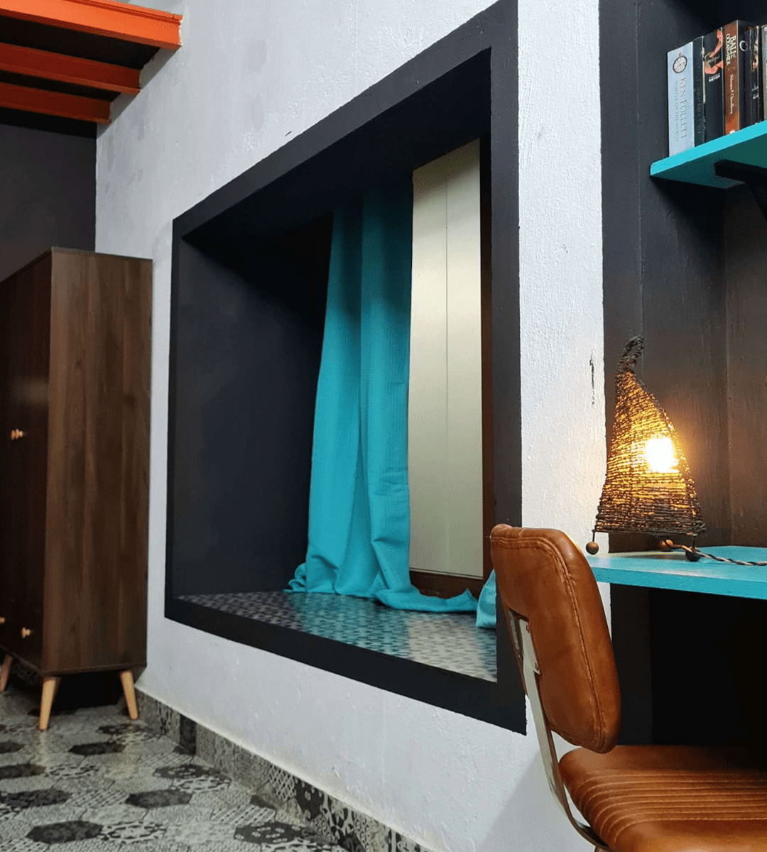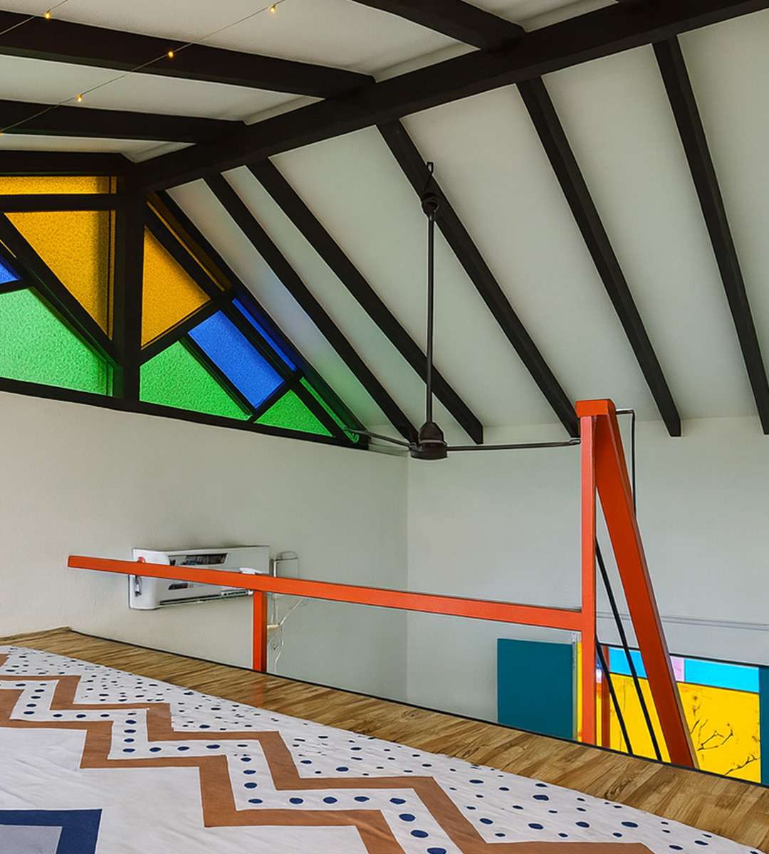 bask in relaxation as sunlight filters through traditional colored glass windows. the loft, a cozy sleeping nook with a spacious 6×6 floor mattress, overlooks a private work and lounge area, complete with bay-window seats, 2-door wardrobe, and functional desk.