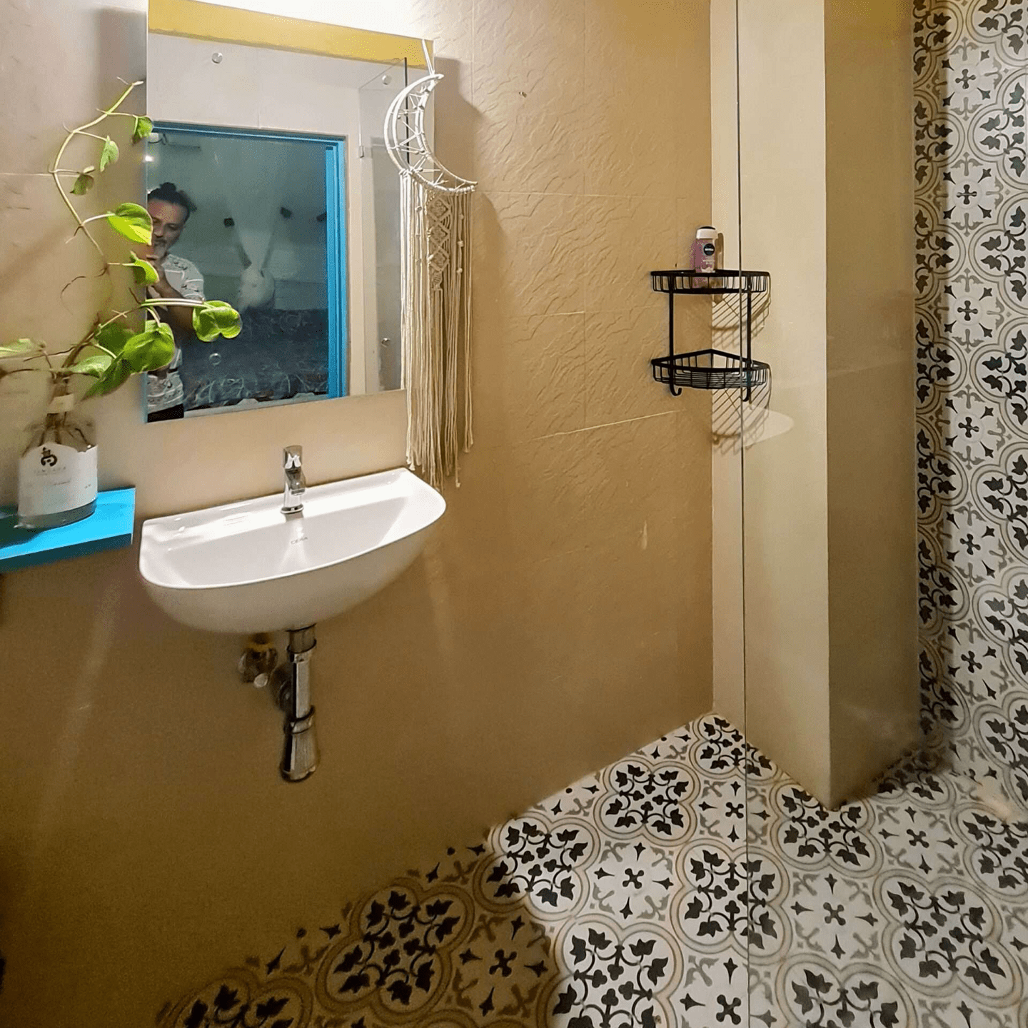 Modern attached bathroom at Valentine Villa Goa - featuring pristine clean fixtures, a spacious walk-in shower, luxury amenities, and traditional design elements in a heritage setting.